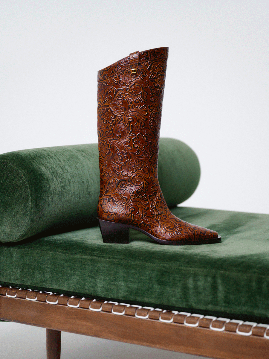 Our iconic Marylin knee-high boot comes in a luxurious suede available in a variety of luminous and desirable shades this season. Made from the softest and finest kind of suede known as “Cashmere suede”, it has a feminine round toe, rises up to the knee at the front and dives elegantly down at the back to meet our signature golden adornment.